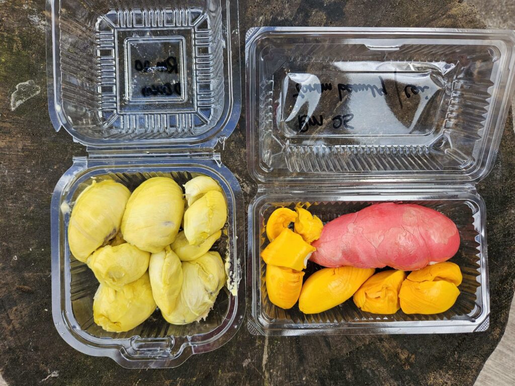 Another fruit that is a must-try while you’re here is red and orange durians (pictured). These durians are seasonal and are not as pungent as the ones you have heard about. Stall owners typically sell them in small portions at affordable prices for you to taste them!