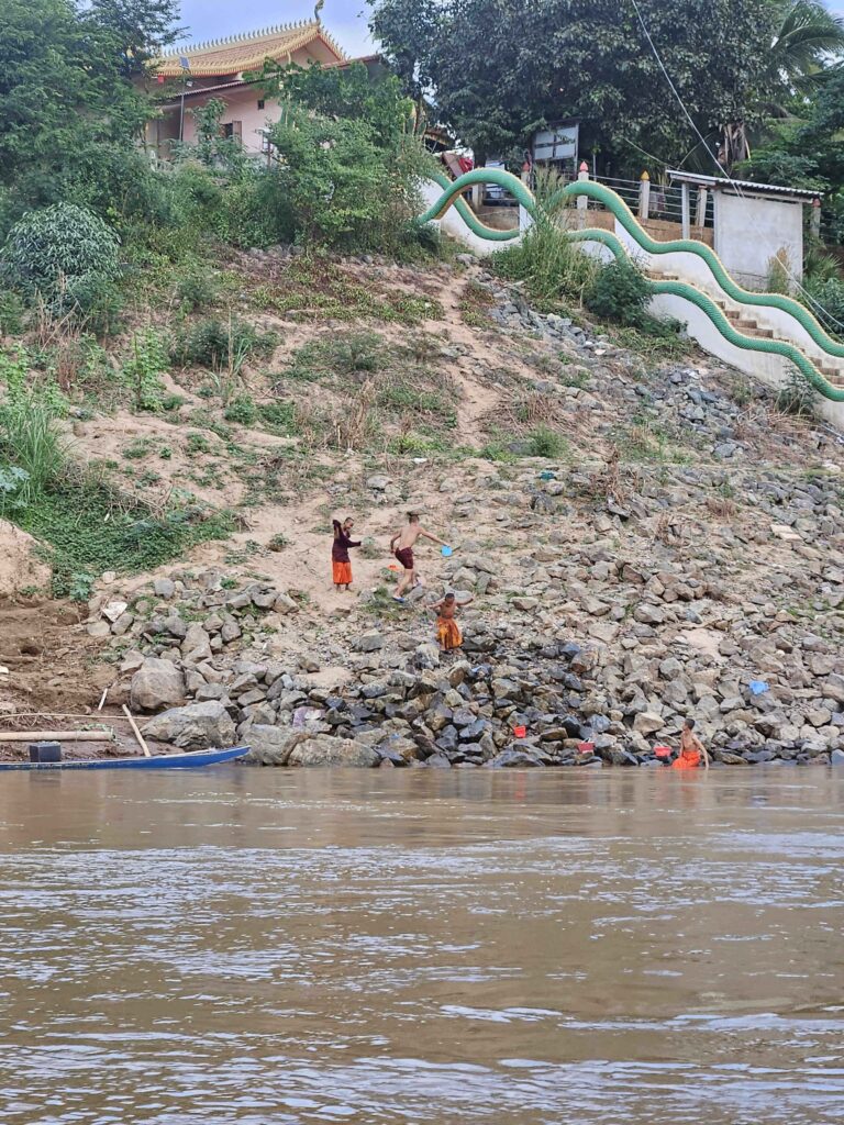 Local Laotian children enjoying themselves along Mekong River, unafraid of falling