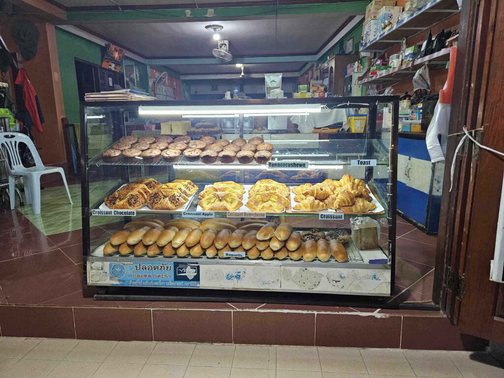 Just before I boarded the slow boat for the second part of my journey from Pak Beng to Huay Xai, I bought pastries and cakes at the shops on the main street in Pak Beng as they looked amazing! However, if you prefer savoury food, there are shops selling sandwiches for takeaway. Fresh fruit smoothies are also available.